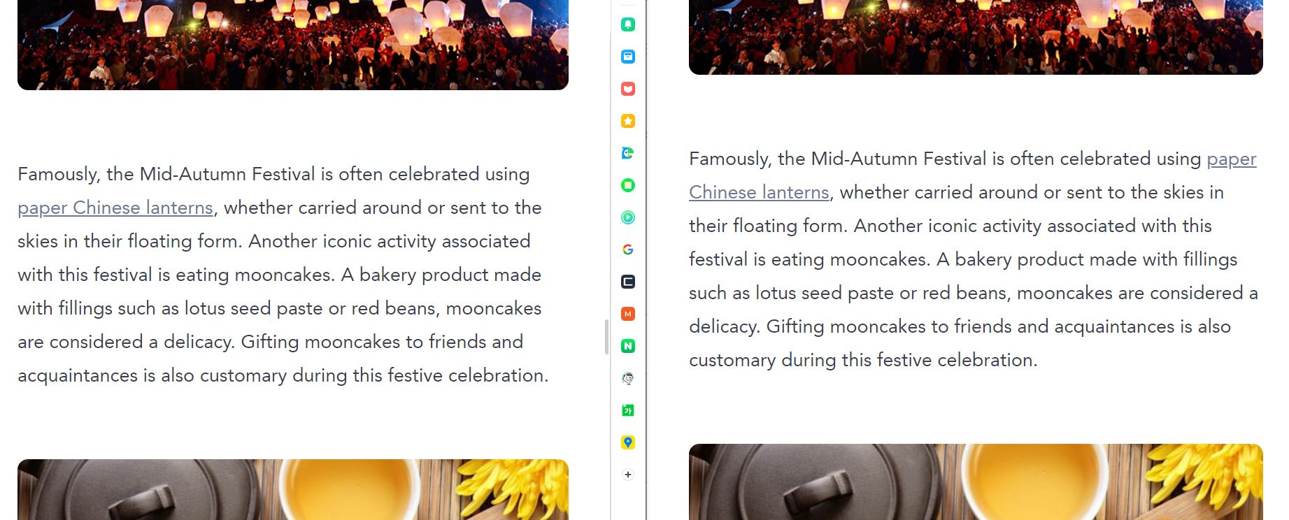 유명하게도, 중추절은 종종 종이 등불을 사용하여 축하 합니다. 이 축제와 관련된 또 다른 상징적 인 활동은 월병을 먹는 것입니다. 연꽃 씨 페이스트 나 팥, 월병과 같은 속으로 만든 베이커리 제품은 진미로 간주됩니다. 이 축제 기간 동안 친구와 지인에게 월병을 선물하는 것도 관례입니다.