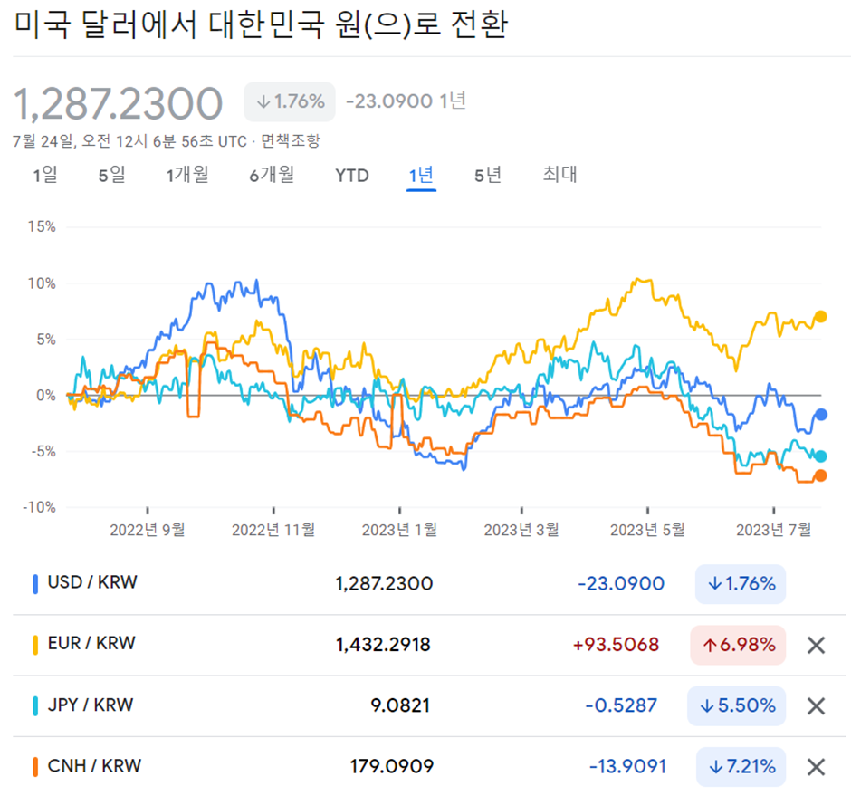 2. 한화 기준 전년동월 대비 유로화 +6.98%, 달러-1.76%, 엔화 -5.5%, 위환화 -7.21%의 방향성을 갖고 있다.