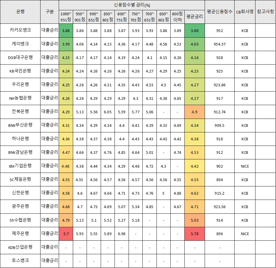 신용점수 1,000점~951점 등급 기준으로 낮은 금리로 정리해 보았다.
