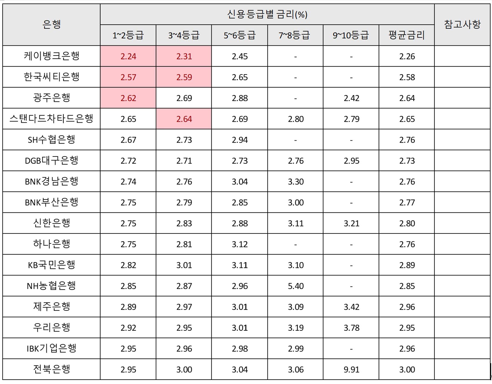 등급별로 금리차가 있으나 2020년 1월 기준 케이뱅크은행 한국시티은행이 1,2위를 차지하고 있다.
